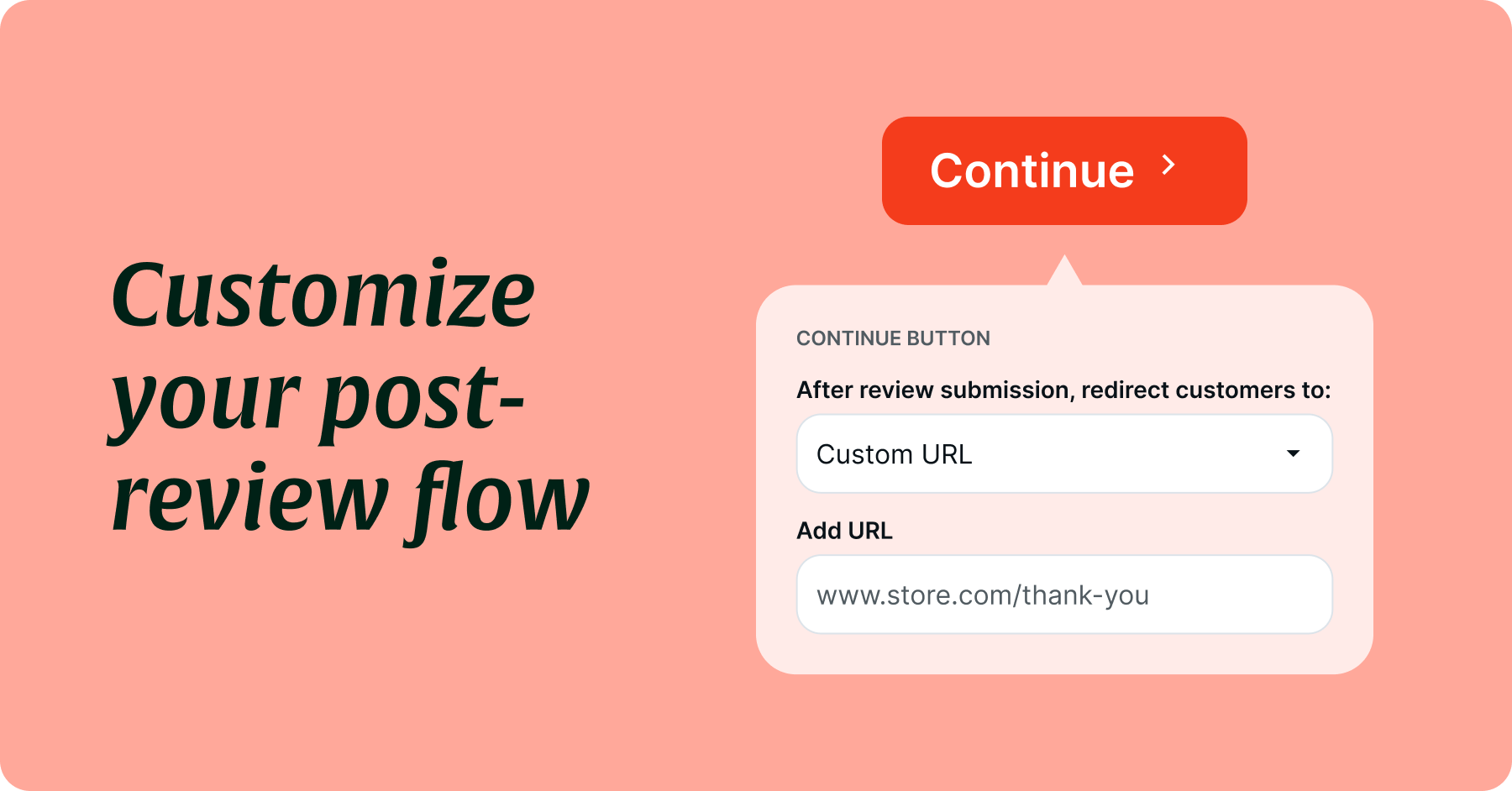 After someone leaves a review, where should they go next? Now you decide. Customize your review form and redirect customers to your product page, homepage, or any custom URL to keep them engaged and shopping.